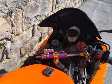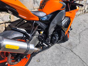 vendo la mia zx10r 2008 arancione perlato. la moto ha pochissimi km (poco più di 12000 su strada e su pista avrà fatto circa una decina di giornate in prove libere amatoriali) perché da anni la uso solo per pochissimo tempo e spesso è sui cavalletti. Nei suoi primi anni di vita ho fatto qualche uscita in pista da amatore (scarso)... la moto è preparata da pista. sempre stata usata per fare giretti nel week-end. sospensioni con mono Mupo, cartucce forcella racing Mupo preparate da paioli, ammortizzatore sterzo hyperpro. Impianto frenante con pinze Brembo M4 con dischi full flottanti diametro maggiorato, tubi treccia, pinza freno accossato. scarico con collettori racing Arrow, centralina rapid bike con selettore mappa al manubrio (con e senza DB killer), filtro aria alta permeabilità, catena passo stretto con corona e pignone a rapporti accorciati. componentistica estetica tipo cupolino puig parafango posteriore puig e anteriore in carbonio. sicuramente dimentico qualcosa, perché la lista è infinita. tagliandata e revisionata da pochi giorni. La metto in vendita solo per appassionati perché purtroppo mi rendo conto che ormai da diversi anni non ho più la voglia di andare a fare giri sportivi e quindi alla fine la uso pochissimo. Dispongo di tutti i pezzi originali tranne le pinze freno mi pare perché un amico con la precedente zx10r me le aveva chieste per upgrade alla sua, ma poi non me le ha più restituite.