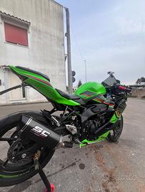 La moto presenta le seguenti caratteristiche: 8.575 km reali, immatricolata 2024, 4 cilindri, mai uscita in pista. Pneumatici Bridgestone S22 montati 5 mesi fa, scarico SC-Project, specchietti Rizoma + specchietti originali disponibili. Peso 188-189 kg, serbatoio 15 L.