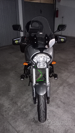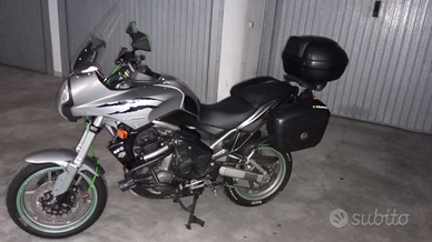 Moto tenuta perfettamente, come da foto. Riverniciata completamente nel 2024. Pneumatici Pirelli Diablo 2 mescola sostituiti da soli 2.000 km, cupolino rialzato, cavalletto laterale e centrale, scarico omologato LeoVince, tris bauletti, leve freno/frizione in alluminio, regolabili e pieghevoli. Paramotore e faretti a led. Doppia presa USB con rilevatore di tensione. Sempre tagliandata.