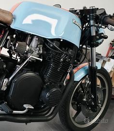 Kawasaki Z 1000 ST anno 1980, stile retrò cafè recer. Curata nei dettagli, verniciatura appena eseguita, colore azzurro ed arancio, parafango corto, impianto elettrico nuovo, blocco motore nero opaco. Cupolino posteriore, creazione mono posto, colore azzurro con striscia arancio, il cupolino è rimovibile, può essere montato e tolto mantenendo la stessa sella. Sella artigianale su base del telaio, colore marrone. Quattro carburatori, un bel sound, scarichi bassi corti, omologati, tagliando eseguito, revisione cardano, tubi freni rinforzanti, trattamento interno serbatoio . In possesso di ricambi originali per un eventuale ripristino della moto allo stato originale. Revisione effettuata, pronta all'uso. Molto bella.