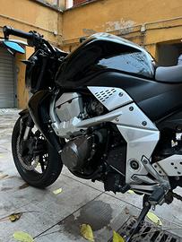 Vengo Kawasaki z750 depotenziata per A2 (solo a libretto), la moto monta svariati accessori come pompa freno brembo rcs 19 con tubi in treccia, fari a led, manubrio ribassato, scarico akrapovic e porta targa pieghevole. E stato eseguito il tagliando prima dell'estate la moto è stata usata poco montate anche gomme Pirelli super corsa BSB con neanche 500km (un uscita e qualche spostamento casa università) presenta sul serbatoio ancora adesivo originale qualche segno dato dall'età della moto e un piccolo bozzo sul serbatoio.