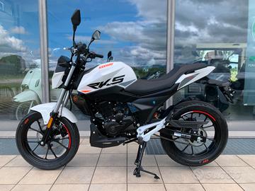 Keeway RKS 125 (CBS - Euro 5+) equipaggiata con motore monocilindrico raffreddato ad aria e olio con 8 Kw - 11 Cv , con fari e frecce full Led, LCD moderno da 5'' completo di tutte le informazioni per il pilota e un peso a secco di soli 133kg.