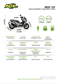 Il NEXY 125 introduce l'innovazione HYBRID nel mondo degli scooter KL, con un motore 4 valvole raffreddato a liquido che abbassa i consumi (solo 2 lt per 100 km). Dotato di mirroring sul cruscotto e compatibile con Apple CarPlay, NEXY offre comodità e tecnologia in un unico modello, perfetto per chi cerca risparmio e innovazione.