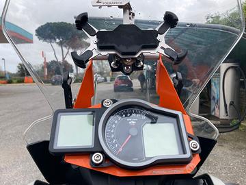 Accessori originali KTM: borse rigide Touring, cavalletto centrale, barre di protezione, selle ergonomiche in gel sia conducente che passeggero, parabrezza alto, specchietti ADV 1190, protezione termica collettore in carbonio, coperchi freno e frizione in ergal, adesivi cerchi, presa usb