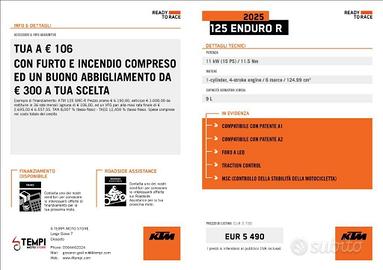 KTM 125 Enduro R color Arancio del 2026. Il motociclo è alimentato a Benzina e ha un cambio Meccanico. Pratica: Tua da € 106 al mese Servizi 4 Tempi Moto Store * Finanziabile fino all'intero importo * Assicurazione Motoplatinum, tra le più competitive sul mercato * Possibilità di permutare il vostro usato. * Possibilità di consegna a domicilio su tutto il territorio nazionale 4 Tempi Moto.....Passione su 2 Ruote