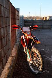 La moto ha molte powerparts tra cui leve in ergal, 2 set di paramani, manopole progrip nuove, specchietti piccoli, pastiglie posteriori accossato nuove, terminale fmf powercore 2, cavalletto anodizzato arancione, tappi pompa freno e frizione in ergal, corona arancione, puntale freno posteriore in ergal, puntale leva del cambio in ergal e altro.