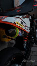 Moto con 375h di telaio. Motore rifatto a 237h e pistone cambiato a 332h, quindi ora ha poco più di 30 ore. Sempre miscelata con olio premium da 35? in su e tagliandata ogni 35h. Sottolineo che ovviamente la moto è targata, anche se non ha il portatarga nelle foto, OMOLOGATA motard e enduro.