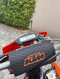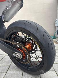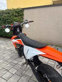La moto monta cerchi "Excel" da 17 pollici acquistati nel 2023. kit trasmissione nuovo con rapporti stradali, monta un 13-42. impianto elettrico completo con 4 frecce led,faro anteriore e faro posteriore led accensione manuale con la pedivella, accensione impianto elettrico con blocchetto chiave. Porta targa ktm originale