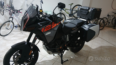 Splendida moto pronta a viaggiare super accessoriata si vede benissimo in foto,tenuta sempre in garace e su cavalletti...gommata 2000km fa' con pirelli scorpion trail,moto con 28700 km.. tris di valige,faretti aggiuntivi originali,para carena basso,sotto coppa in alluminio,selle in gel comodissime,tengo anche quelle originali.....cedo inoltre nel prezzo doppio cupolino di cui uno fume' e un cavalletto solleva moto..non esitate a contattarmi prezzo trattabile o cambio con auto utilitaria mio gradimento.. Nb:inoltre vendo a parte tantissimi vestiari da moto la maggior parte originali ktm.con terminale acrapovic e ben 160cv gestiti da 4 mappature diverse...moto non per principianti