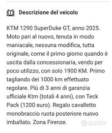 Vendo Ktm SuperDuke GT 1290. Anno 2025, solo 1900 km, con Teck Pack, NUOVISSIMA. In garanzia.