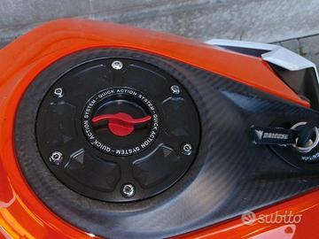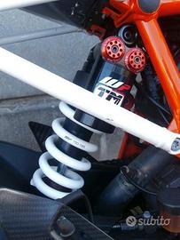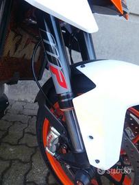PROTEZIONE RADIATORE KTM, PIASTRE FORCELLA ANT. LEVE FRENO + FRIZIONE IN ERGAL, PEDANE ARRETRATE, SOSPENSIONI ANT. POST. WP APRE XPRO,SCARICO COMPLETO AKRAPOVIC, SELLA MONOPOSTO,TAMPONI PARATELAIO, MANUBRIO E SERBATOI FRENO E FRIZIONE RIZOMA, STAFFA SCARICO IN CARBONIO, + ORIGINALI