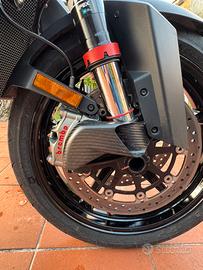Monta scarico completo in titanio Akrapovich, filtro aria BMC, convogliatori aria pinze anteriori, protezione radiatore, porta targa Evotech, monoposto, quickshifter+, MTC.