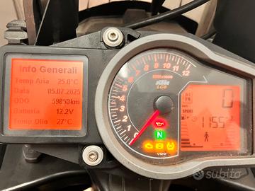 Vendo per inutilizzo Ktm 1290 T 160 cavalli. immatricolata Gennaio 2018, con 59.850km. La moto ha i seguenti accessori; -Manopole riscaldabili con 3 livelli di potenza. -Sella conducente e passeggero riscaldabili autonomamente con 3 livelli di potenza. -Cruise control - Cupolino maggiorato regolabile in altezza - Scarico Remus 8 - Navigatore satellitare Garmin - presa USB per ricarica cellulare o altri dispositivi elettronici - presa 12volt - Batteria nuova - Kit trasmissione nuovo (meno di 400km) - Cavalletto laterale e centrale Ovviamente do anche lo scarico originale ancora Nuovo, mai usato. 2 borse laterali originali Ktm rigide di cui una ha l'ingranaggio di incastro rotto a causa di un tentativo di furto della stessa, ma perfettamente funzionante. La moto è senza assicurazione per tanto sarà visibile solo ed esclusivamente presso il mio domicilio a Santa Flavia (PA). Primo contatto tramite mail. Grazie Gianfranco