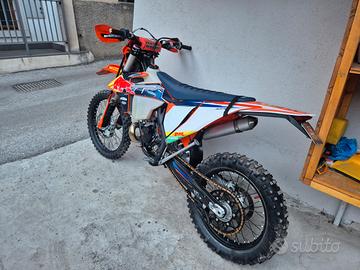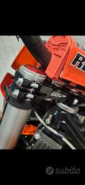Vendo ktm 150 exc tpi modello 2022 immatricolato 05/2023 con all'attivo solo 80 ore. Monta kit sposta inniettori Tecnallmec con eliminazione miscelatore (funziona come un carburatore). Ventola al radiatore. Piastre di sterzo ktm powerparts regolabili. Forcelle preparate con trattamento steli DLC nero alta scorrevolezza e cartucce cone valve 6500 cartuccia chiusa. Monta mousse balls Mrwolf da estermo al posteriore e mousse al anteriore. Disco del freno posteriore pieno con protezione. Copertina sella rinforzata. Protezioni carter frizione e volano. Protezioni telaio e forcellone. Cinghie anteriore e posteriore. Portatarga sgancio rapido. Faro anteriore a led. Vendo tagliandata e con gomma nuova. Insieme alla moto ovviamente fornisco tutti i pezzi originali, le plastiche, un'altra marmitta nuova più quella per fare la revisione kit frecce specchietti portatarga. Cartucce e piastre originali. Prezzo 6000 euro originale. Per averla con tutte le cose elencate se ne parla in fase di vendita. Eventualmente in caso di acquisto possibilità di trasporto presso il proprio domicilio zona Nord Italia.