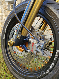 La moto monta kit motard con Cerchi Faba Strong.