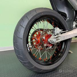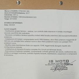 KTM EXC 300 2T.GARANTITA 12 MESI.POSSIBILITA' DI FINANZIAMENTO ANCHE CON FORMULA AL 50% CON MAXIRATA FINALE.POSSIBILITA' DI TRASPORTO IN TUTTA ITALIA.IMMATRICOLAZIONE 12/2016 MA VERSIONE 2017, allestimento motard, moto in ottime condizioni meccaniche, con motore rifatto e lavori documentati.Dati principali:- 300 cc - 2 Tempi- Carburatore Keihin PWK 38 mm- 6 marce- Avviamento elettrico + pedivella- Conta ore- Termometro temperatura- No miscelatoreLavori eseguiti (08/2024 - officina IB Moto):- Revisione completa e taratura motard forcella anteriore e mono posteriore- Tagliando completo con controllo generale del veicolo- Sostituzione gruppo termico e pistone con controllo tolleranze 90 ORE DI BLOCCO, 400 ORE / 16'000 KM DI TELAIO- Verifica serraggi bulloneria e componenti di sicurezza- Allestimento motard:- Cerchi VMX tubeless- Disco freno anteriore maggiorato Ø320 mm- Pastiglie freno anteriori e posteriori nuove- Trasmissione allungata 13/48- Scarico completo Pro Circuit con terminale ShortyAccessori:- Faro Ghost motard luce bianca- Portatarga corto pieghevole GT Lab- Frecce anteriori e posteriori (solo estetica)Parti originali incluse:Cerchi originali enduro con gomme e mousse (circa 50%)