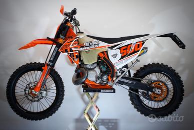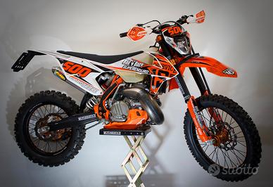 KTM EXC 300 2017 modificata con il motore canadese BRC 500 2t.Attenzione questo non é un CR500 oppure un KX500... é un vero e proprio KTM 500 2T!In confronto alle datata CR ecc da 500 2t - questa moto é realmente guidabile avendo anche la valvola di scarico, il contralbero per ridurre le vibrazioni e persino l avviamento elettrico!!La base é un EXC300 2017 (a carburatore), per esempio cambio e frizione rimangono della moto base ma la gran parte viene sostituita con le parti che produce la ditta canadese BRC Racing.Abbiamo ripristinato l intera moto. Il motore ha ca 50ore di utilizzo. Il telaio con i vari cuscinettiecc é stato ripristinato completamente e rimesso a posto. Plastiche nuove con grafiche racing. Cerchinuovi, faro LED, paramotore acerbis, paramani acerbis, protezione forcellone,.... e moltissimi pezzi nuovi.Guarda sul ns sito www.motoservice.bz.it se é ancora disponibile.possibilitá di spedizione in tutta italia