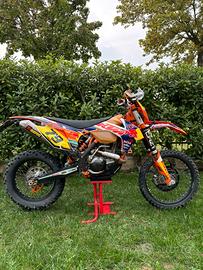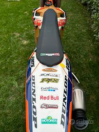 Moto con 250 ore in perfette condizioni appena sostituito: regolatore di tensione, motorino avviamento, batteria, attuatore frizione, cavo frizione, trasmissione completa (catena, pignone, corona), disco freno anteriore + posteriore, pastiglie freni anteriore + posteriore, camere rinforzate, tutto documentato. Triplo kit carene due arancioni e una originale bianca, doppio scarico, originale six days (perfetto) più akrapovic titanio e tanto altro...