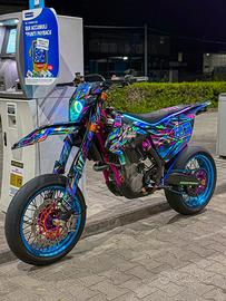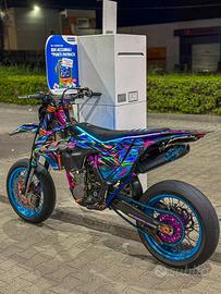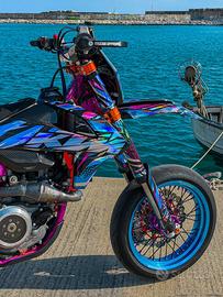 Moto in condizioni eccellenti, sempre tenuta in garage su cavalletto. Manutenzione sempre eseguita con cura. Motore rifatto completamente (pistone + rettifica). Sospensioni rifatte da FG Suspension meno di 10h fa. Allestimento completo supermotard con molti accessori: •Centralina mappata (+8cv, map 2 con hardcut, pop&bang, cambio elettronico) •Aspirazione modificata con filtro a cono •Scarico completo FMF 4.1 RCT + Megabomb •Impianto frenante radiale Accossato •Cerchi Falco 17” con dettagli anodizzati •Sospensioni rifatte (FG Suspension) •Faro RGB Movetronix •Carter frizione trasparente CNC •Gomme Metzeler K3 RR nuove •Componenti in carbonio CMT (paratelaio, serbatoio, forcellone) •Sella Alcantara Dripstreet •Pedane ergal •Porta targa pieghevole Insieme alla moto fornisco anche plastiche originali Six Days + altre grafiche. Moto pronta all’uso, nessun lavoro da fare.