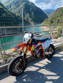 Ktm 450 Sx F Smr 2021 Factory Supermoto - Omologata, immatricolata e targata - 49 ore - Cambio olio e filtro ogni 5 ore La versione Factory comprende: - Telaio Arancione - Paramotore in carbonio forgiato - Coperchio frizione Hinson - Silenziatore Akrapovic La moto é preparata pronto pista con i seguenti accessori: - Forcelle Dal Soggio, taratura by Tiziano Monti, piede radiale 108mm, mozzo 20mm con dado in acciaio - Piastre Supermoto nere 200mm - Cerchio anteriore + slick 16" - Disco freno ant 6mm - Pinza Brembo CNC 108mm - Pompa Brembo RCS Corsacorta 15 - Convogliatore aria impianto freno anteriore - Cerchio posteriore + slick 17" + corona 45 - Forcellone Tecstra Supermoto - Preparazione mono posteriore by Tiziano Monti - Frizione antisaltellamento STM - Centralina Vortex - Cambio elettronico - Paramani Moose