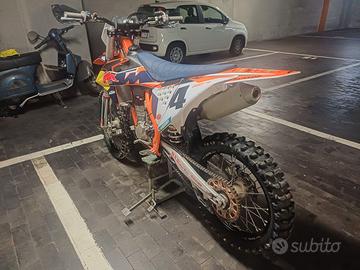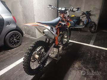 Vendo ktm 450 sx-f 2022. La moto ha solo 16 ore, usata come muletto per insegnare a mia figlia minicross. Gomme al 80%, mousse nuove davanti e dietro. Includo nel prezzo pezzi di ricambio come mascherina da enduro, codino da enduro con portatarga, cavalletto laterale originale e una scatola di pezzi originali e pedane racing come accessori. Paramotore Acerbis. La moto viene consegnata con olio e filtro olio nuovi. Per altre foto dei particolari scrivetemi su wa al 3381997384 o chiamate