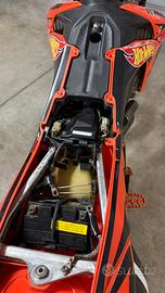 vendo KTM 450 sx-f cross modello restyling del 2012, l'ultima a carburatore, una vera bomba da 60cv con peso ridotto (dal 2013 a iniezione), accensione solo elettrica, introvabile in queste condizioni, moto da rodare. - pistone alta compressione nuovo - cilindro (si vede il colore in foto) nuovo - forcella revisionata - cerchi con mozzi KITE in ergal - dischi braking con anteriore 270 - trasmissione catena corona e pignone nuova - tubi acqua silicone colore arancio - cavi acceleratore nuovi - batteria nuova - plastiche nuove - plastiche originali disponibili - freni, frizione e cambio ok - gomme nuove Pirelli scorpion - bulloneria nuova - svariati pezzi in ergal E tanto altro! Cross motard enduro adventure
