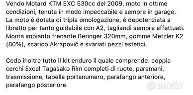 Vendo Motard KTM EXC 530cc del 2009, moto in ottime condizioni, tenuta in modo impeccabile e sempre in garage.