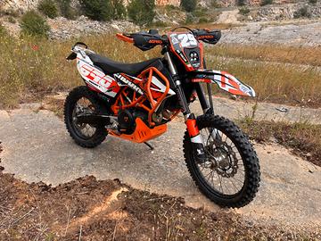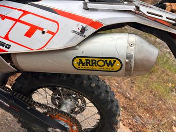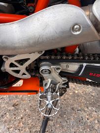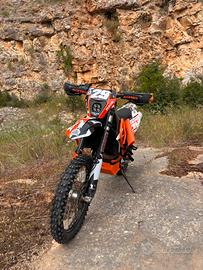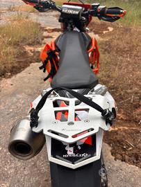 Anteriore completamente sosituito : cerchio anteriore provenienza ktm 300 tpi, forcella preparata e modificata con regolazioni sopra e sotto da lotito moto, disco flottante a margherita, parafango e faro provenienza ktm 450 2023, manubrio piega bassa reikon, paramani acerbis, leva corta magura, pedane basculati ktm powerparts, paramotore axp, catena corona e pignone sostituiti con rapportatura studiata per l enduro, para telaio arancioni, porta pacchi turateck, mousse ant+ post, frizione ( sughero + acciaio + cestello) originali nuove, distribuzione eseguita, filtro aria racing,marmitta arrow .leva cambio + leva freno post, in ergal rinforzate.