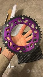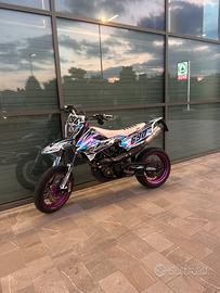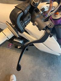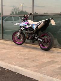 Vendo a malincuore ktm smc 690 per passaggio a naked, la moto nonostante l'alto chilometraggio va perfettamente e monta ancora uno degli ultimi motori LC4 puramente austriaci montati qui in europa prima dei cambio di proprietà e del montaggio effettuato in Asia, al momento monta delle Pirelli diablo rosso 2, pastiglie anteriori appena sostituite. Moto depotenziata a libretto, dotata di selettore delle mappe sotto la sella per scegliere la potenza erogata (depotenziata, potenza piena, una più sportiva). Come si può vedere nelle foto la moto ha svariate modifiche: - faro angel eye movetronix controllabile tramite app sul telefono (250€) - pompa anteriore radiale brembo 16x18 (230€) - kit cerchi e corona viola falco (1000€) - pedane anodizzate viola septar (200€) - kit grafiche slick design (280€) - terminale leovince omologato (400€) - portatarga pieghevole - rivestimento sella rifatto bianco con dettagli viola - manubrio bianco - piastre anodizzate viola In più fornisco una corona da 17 presa sul sito falco+uno scatolone con diverse parti e accessori che mi aveva dato il vecchio proprietario. La corona e il pignone sono appena stati cambiati, la catena era stata fatta poco prima, quindi trasmissione quasi nuova. Il contachilometri non è preciso per il fatto che i cerchi non sono quelli originali ma sono stati cambiati e la spia della riserva non va per un problema al sensore, presenta qualche graffio sul carter lato destro e una piccola grattata sempre sulla pedana destra per una caduta ma niente di grave o molto visibile, ci sarebbe (se uno ne avesse voglia) da sistemare il cavo del pulsante della luce abbagliante del faro, il faro in se è perfetto e funziona benissimo, non va soltanto la luce abbagliante e un pezzo unito al telaio rotto a causa di una caduta ma si può cambiare con 45/50€. Valuto scambi con yamaha mt07. Per qualsiasi informazione chiedete pure, la moto è disponibile per essere vista dal vivo ma per favore no perdi tempo. Foto/video whatsapp