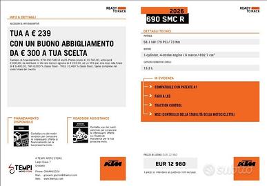 KTM 690 SMC -R color arancio del 2026. Il motociclo è alimentato a Benzina e ha un cambio Meccanico. Pratica: Tua da € 239 al mese Servizi 4 Tempi Moto Store * Finanziabile fino all'intero importo * Assicurazione Motoplatinum, tra le più competitive sul mercato * Possibilità di permutare il vostro usato. * Possibilità di consegna a domicilio su tutto il territorio nazionale 4 Tempi Moto.....Passione su 2 Ruote