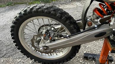 Sostituite molle forcella ed ammortizzatore post con molle WP piu dure( per diverso peso) e cedo le originali , cambiato disco e pasticche anteriore . Gomma post quasi da sostituire. Mai cross solo enduro su cararecce e strade bianche dei dintorni di casa Invio su richiesta altre foto e video cerchi 19/16