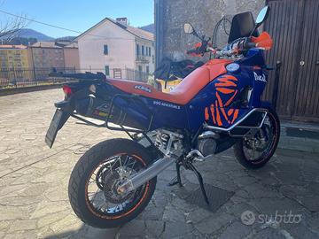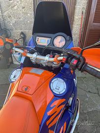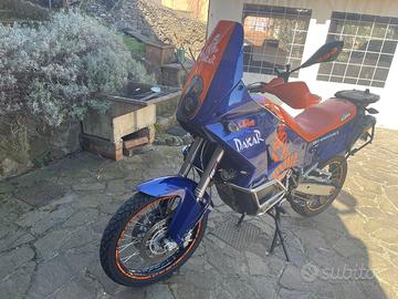 La più ricercata, vera icona rally anni 2000 nella sua versione con sospensioni racing White Power. Completamente originale, usata x turismo a ritmi blandi, 46000 km, sempre tagliandata (ultimo in concessionaria KTM di Tortona Lunaschi, con regolazione gioco valvole e pompa dell'acqua+ pulizia corpi farfallati). Scarichi carbonio + originali (suono meraviglioso), supporti valigie givi + paramotore, batteria gel nuova, kit catena seminuovo, senza graffi o segni evidenti, perfetta in ogni dettaglio. Kit doppio faro a Led bellissimo, doppio cupolino originale nuovo+ cupolino in tinta bicolore. Pneumatici nuovi a vs. scelta inclusi nel prezzo di acquisto.