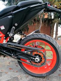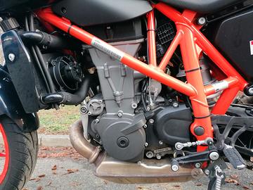 Vendesi KTM 690 DUKE R ABS del 07/2017, 31.000 km, condizioni generali molto buone, qualche segnetto di utilizzo e piccola ammaccatura sul terminale per caduta praticamente da fermo, tagliandata e gommata seminuova, versione R con scarico Akrapovic e pinza monoblocco Brembo M50, sospensioni WP completamente regolabili, pedane arretrate, sella più alta e manubrio più basso rispetto alla standard, il tutto di serie, per una guida più aggressiva e precisa.