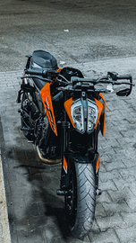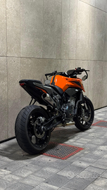Monta scarico Arrow in titanio, sella comfort powerparts Ktm, porta targa lightech, specchietti ribassati, tamponi Evotech sulle ruote, pararadiatore.