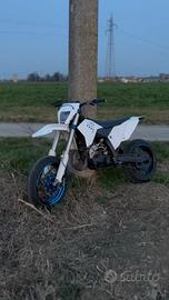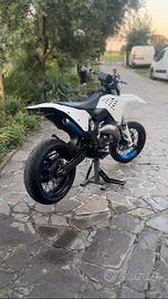 Vendo a malincuore questo ktm exc 125 del 2010 la moto ha motore nuovo con 65h totali di motore e forcelle revisionate attualmente hanno 25h il mono ne ha 60 La moto monta: Cerchi motard pr.custom. garage da 17" Gomme pirelli diablo rosse due ancora in buone condizioni Piastre ricavate dal pieno di corradetti racing con interasse motard Pancia hgs in ottime condizioni appena pulita sia dentro che fuori Silenziatore hgs anodizzato colore blu Vari parti in ergal come: pedane, puntalino del freno ,leva frizione nr team, tappino della frizione nr team coperchio olio freno anteriore accossato, viti convogliatori e qualche rondella Disco freno pr custom garage flottante Tubo in treccia accossato Pompa freno adelin 16x16 Manubrio nk da 28,6mm Coprisella da wob design Tubi radiatore samco con il bypass della valvola termostatica colore blu Pompa freno dietro appena revisionata e maggiorata Serbatoietto olio maggiorato nr team Tamponi fatti in 3d Portatarga pieghevole gt lab Impianto elettrico fatto personalmente da me e funzionante Insieme alla moto cedo: Mono ammortizzatore originale preparato endurocon 20h Corona 60 denti Manopole nuove usate una volta Specchietti completamente omologati Nel caso di richiesta posso cedere: Cavalletto centrale tappeto abbinato alla moto 24mx mantenitore per la batteria con attacco apposito per la ricarica Secondo portatarga (regolabile e verniciato professionalmente nero) con faretto fumè mai montato sulla moto a causa della vendita IL PREZZO E TRATTABILE VISIONE DISPONIBILE DOPO IL 4 MAGGIO NO PERDITEMPO, NO AFFARISTI