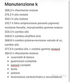 Vendo a malincuore, causa inutilizzo (10h circa negli ultimi 2 anni), questo fantastico ktm. La moto è six days anno 2012, circa 380 ore all'attivo, il motore è stato appena rifatto e dimostrabile con la documentazione, come si può leggere nella scheda della manutenzione nell'ultima foto. La moto è stata utilizzata per lo più per uscite in fuoristrada semplici o giri per strada "brevi" o ritrovi.