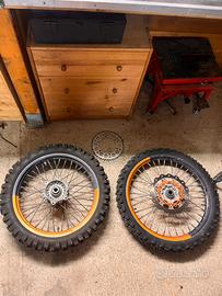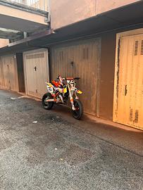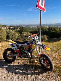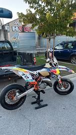 Vendo KTM exc 125 per passaggio a cilindrata superiore. La moto è sempre stata tenuta al chiuso in garage e trattata con la massima cura. Il motore è stato appena rifatto completamente, con la sostituzione di: pistone; biella; cuscinetti; paraoli; frizione; revisione della pompa dell'acqua; revisione attuatore frizione; bilanciatura albero. Al momento la moto presenta un kit motard composto da: cerchi faba neri con mozzi anodizzati arancioni (raggi neri e nipples anodizzati arancioni); gomme continental contiattack SM EVO (120/70/17 all'anteriore e 160/60/17 al posteriore); disco anteriore motomaster da 320; spostapinza motomaster; pignone da 13; corona motomaster anodizzata arancione da 41. È inoltre compreso un kit enduro composto da: cerchi alpina bicolor arancione/nero; disco freno anteriore con dettagli arancioni da 260; pignone da 13; corona da 44; La moto inoltre monta: espansione pro circuit; terminale Messico; pompa frizione brembo; piastre anodizzate arancioni; varie parti anodizzate arancioni del catalogo ktm powerparts; Sono compresi nel prezzo anche due kit di plastiche aggiuntive a quelli in foto e tutti i vari pezzi originali della moto. Per maggiori informazioni o foto scrivetemi pure. Prezzo trattabile.