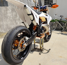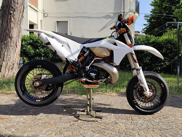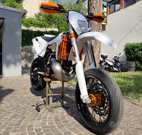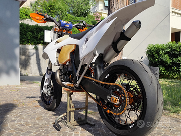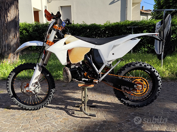 Vendo Ktm exc 250 2t anno 2012 targato e omologato motard. La moto ha subito da poco un restauro completo: è stata portata a telaio e sono stati sostituiti i cuscinetti di sterzo, revisionata pinza freno anteriore, pompa freno anteriore, pompa frizione e attuatore frizione. Il motore è stato totalmente revisionato ed al momento ha all'attivo 15 h di utilizzo, sono stati sostituiti pistone, biella, gabbia a rulli, cuscinetti di banco, cuscinetti del cambio, kit guarnizioni, kit paraoli e collettore di aspirazione. Anche il kit motard ha 15 h di utilizzo e comprende cerchi neri con mozzo anodizzato arancione, gomme Continental contiattack sm evo, corona nera, catena arancione, spostapinza per disco da 320mm, dischi e pastiglie freno. Come protezioni la moto monta paramotore in alluminio ktm, paratelaio neri, copri forcellone polisport neri, copri espansione in fibra, protezione radiatori in alluminio e paramani. Kit plastiche bianche acerbis completo appena montato 0 h ; leve freno e frizione, pedane, tappi vaschette freni, registri tendicatena tutto anodizzato arancione. Cedo anche kit enduro con cerchi faba neri con mozzo anodizzato arancione, mousse anteriore e posteriore, gomme 70%, catena e corona arancioni, disco anteriore e posteriore nuovi 0 h, paradisco posteriore anodizzato arancione e portatarga estraibile. Attualmente la moto monta un impianto elettrico semplificato ma dispongo di impianto completo nuovo ancora imbustato. Insieme alla moto cedo diversi kit di plastiche, ricambi originali, tappo filtro aria per lavaggio, specchietti, frecce, pancia con strozzature, sella originale, sella ktm powerparts e svariate guarnizioni, o-ring e paraoli per revisione motore.