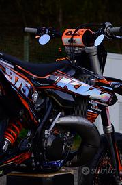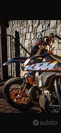 Scarico completo fmf, forcellone anodizzato nero, telaio senza alcun segno, mono arancione, impianto frenante completo RADIALE con pompa bca e pinza brembo maggiorata, dire che la moto è perfetta é a dir poco, ha 150 ore in totale ma il pistone é stato cambiato 20 ore fa, i dischi sono stati cambiati, entrambi galfer, l anteriore è ancora nuovo da mettere, disco da 320, per qualsiasi altra info scrivetemi pure