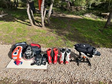 Vendo causa inutilizzo x infortunio di 2 anni fa, da quel giorno utilizata solo una volta. Vendo anche coppia di stivali 44 Gaerne S12 2 caschi taglia M Fox e Bell Pettorina Ufo M Ginocchiere pod Carbon M Occhiali 2 clmpleti taglaia M troylee Kit plastiche originali mai usati Sospensioni con service fatto a ottobre . Scarico originale sixdays mai montato Cavalletto KTM Scaico Akrapovic completo