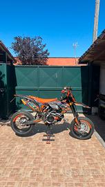 La moto come si può vedere è impeccabile, monta innumerevoli pezzi aftermarket solo di qualità, kit completo cmt compositi(carbonio) circa 1000? cerchi bicolor 300? impianto frenante motard con pinza brembo m4 verniciata arancio 450? disco 320 brembo 200? pompa accossato 19x19 250? motore appena rifatto e dimostrabile con sostituzione completa di tutte le valvole in titanio e molle, pistone vertex alta compressione 280?, tutti i cuscinetti del forcellone e mono cambiati 150?, molla mono da 90kg 120? scarico completo in titanio con fondello in carbonio FMF 4.1 e collettore mivv 1600? centralina rapid bike evo con cambio elettronico sp 550?, selettore mappe ktm power parts 150?, vari pezzi in ergal del valore di all'incirca 250?, in più possiedo un'altro kit di plastiche originali, ho tutti i pezzi originali sostituiti.