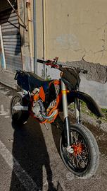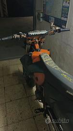 Vendo Ktm 525 del 2004. Ho appena rifatto il motore, dimostrabile con fattura che posso mandare in chat privata. La moto con motore nuovo ha circa 5 ore, perché non ho più attivato l'assicurazione dopo il restauro (dimostrabile, posso inviare la targa in privato per i check). Ha mascherina del modello cross, le plastiche sono tutte originali e nere. Il serbatoio era verniciato dal vecchio proprietario, ho rimosso la vernice ed è del colore originale ora. Scarico artigianale senza DB in titanio, portatarga Gt lab dal valore di 70 euro. Cedo anche faro a led da montare come luce anteriore, impianto elettrico per tale faro è già pronto, anche la staffa per montarlo. Le ruote sono al 40%. Ha radiatore maggiorato con ventola che si attiva con una levetta. Cedo anche cavalletto alza moto. Moto depotenziata a libretto, quindi guidabile con patente A2.