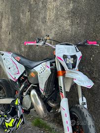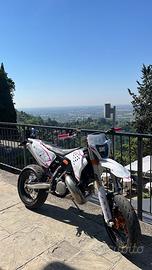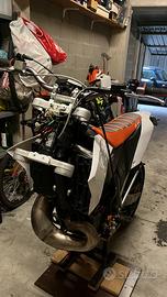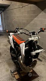 vendo ktm exc 300 del 2011, moto tenuta molto bene sempre tagliandata, manutenzione ordinaria sempre esiguita, cedo doppio kit di plastiche uno con grafiche personalizzate, l'altro originale ktm, la moto ha 30 ore, pacco lamellare vforce rinforzato, piastre six days arancio, motore completamente originale, monta anche una pompa bremo radiale 16x18 disco maggiorato da 320, monta cerchi motard excel, le forcelle sono state accorciate e indurite, in mono e stato indurito e revisionato, infine cedo anche i cerchi da enduro già gommati. prezzo poco trattabile dopo visione
