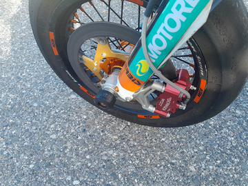 Condizioni generali perfette pari al nuovo! Unico proprietario, 17 ore totali. Scarico titanio completo, cerchi mozzi impianto frenante baringer( appena revisionato assieme a sospensioni) forcelle WP anteriori e mono WP Titanium creati da wp x il mondiale Motard , frizione antisaltellamento ecc.