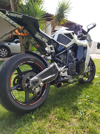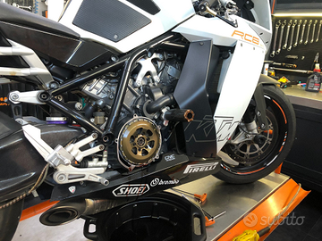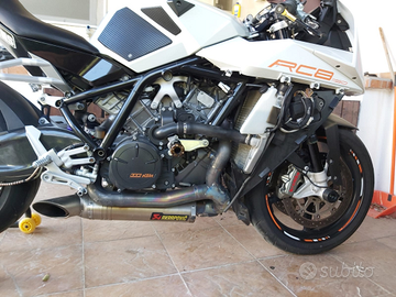 Salve, a malincuore vendo la mia Ktm Rc8 del 2008. Moto perfetta e manutenuta in ogni sua parte, ha all'attivo 32000km, circa 500km fa ho eseguito tagliando completo (olio motul v300, filtro olio originale, filtro aria sportivo K & N e candele all'iridio) + tagliandone in ktm con fattura documentabile in Ktm. A 29000km ho fatto sostituire la precedente frizione antisaltellamento suter con la sua orginale a 6 molle, (quindi ha circa 3000km all'attivo) sempre documentabile con fattura Ktm. Monta scarico Completo Akrapovic evo 2 con mappa dedicata, kit rimozione Sas, le ripiegabili in ergal, attuatore maggiorato della Oberon, monta una centralina anti impennata grip one, disabilitata da me, ma riattivabile tramite i connettori (posseggo anche il manuale di funzionamento), all'avantreno ha sospensioni trattate e brunite per aumentare la scorrevolezza, oltre che le piastre di sterzo della sorella Rc8 R del 2009, al retro treno ha una molla aftermarket Hyperpro, cover in carbonio per il forcellone. Ho le sue 3 chiavi (due nere e una arancione) e il suo manuale di uso e manutenzione originale, il sellino del passeggero (rimovibile e copribile con due tappi in ergal Ktm powerparts). Attualmente sono il suo 4º proprietario e la posseggo da marzo 2020, ho fatto circa 6000 km sopra, non è una moto semplice, va capita ed apprezzata, portata sempre con la frizione puntata e con il gas leggero. Vendo per passaggio alla sorella maggiore da viaggio, perciò permuto esclusivamente con Ktm 1290 Super Adventure dal 2017 in poi. Vi avviso, sarò molto sgarbato se uscirete con offerte insulse ?