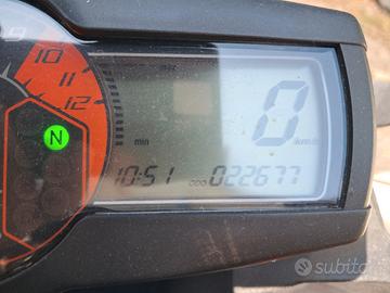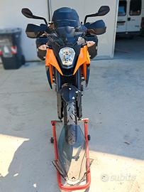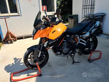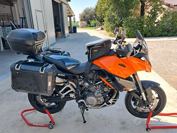 vendo come da titolo KTM SMT 990, modello con ABS (disinseribile) motore LC8. Compreso kit travel con tris valige, sella gel, borsa serbatoio, cavalletto centrale, cupolino maggiorato (oltre a quello normale) , regolazione rapida precarico mono. Monta paracoppa in alluminio e tamponi protezione telaio. Gommata 80% . Gran moto sia per chi ama correre tra le curve grazie alla coppia generosa e ad una ciclistica da sportiva (forcelle e mono WP ultraregolabili), ma anche comoda per i viaggi in coppia con grande capacità di carico. Pastiglie freni praticamente nuove. Unico proprietario, vendo perché faccio pochi km (5/600 l'ultimo anno) ma la moto va benissimo