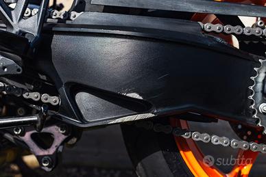 Tutta originale a parte qualche componente aftermarket come leve acossato, serbatoio freno posteriore Evotech Italy, dadi scarico olio ktm Powerparts e griglia pararadiatore ktm.