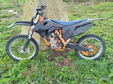 Ktm sx-f 2012, plastiche della 2014 più un set di plastiche arancioni in più. Scarico Akrapovic. Moto con poche ore all'attivo, da poco stata rifatta distribuzione, pistone alta compressione, revisione testa, cambio olio, forcelle, cuscinetti ruote, ingrassato tutto e vari spurghi.