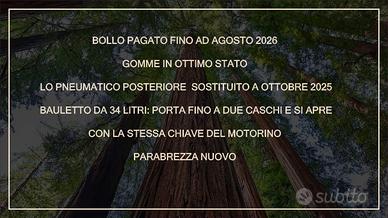 Il mezzo è dotato di parabrezza nuovo e bauletto da 34 litri, molto capiente, in grado di ospitare comodamente due caschi; il bauletto si apre con la stessa chiave del motorino. In omaggio vengono offerti un blocca disco e un casco Givi, come da foto allegate.