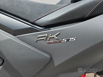 Il nuovo AK 575 Premium alza l'asticella nel segmento dei maxi scooter sportivi, confermando l'ottimo livello delle finiture, lo stile aggressivo ma anche la vocazione più turistica, grazie allo scudo ampio e protettivo e al parabrezza regolabile elettronicamente. Euro 5+. Potenza 52,5 CV. Nuovo motore bicilindrico parallelo. Telaio in alluminio. Sistema ABS a doppio canale Bosch, pinze BREMBO a dischi flottanti, Traction control TCS, freno di stazionamento, strumentazione digitale LCD, faro anteriore doppio FULL LED, manopole riscaldabili, accessori da vero gran turismo, ma anche l'ABS cornering. Completano la dotazione l'acceleratore Ride by Wire, che porta in più diversi power mode, il controllo di trazione e il cruise control. Tre, inoltre, sono modalità di guida disponibili: "Sport" con TCS attivo, "Sport" con TCS disattivato e infine modalità "Rain" con TCS attivo. Garanzia 5 anni. Assistenza stradale 1 anno. Possibilità di finanziamento da 24 a 60 mesi a tasso agevolato. Valutiamo permute con moto o scooter.
